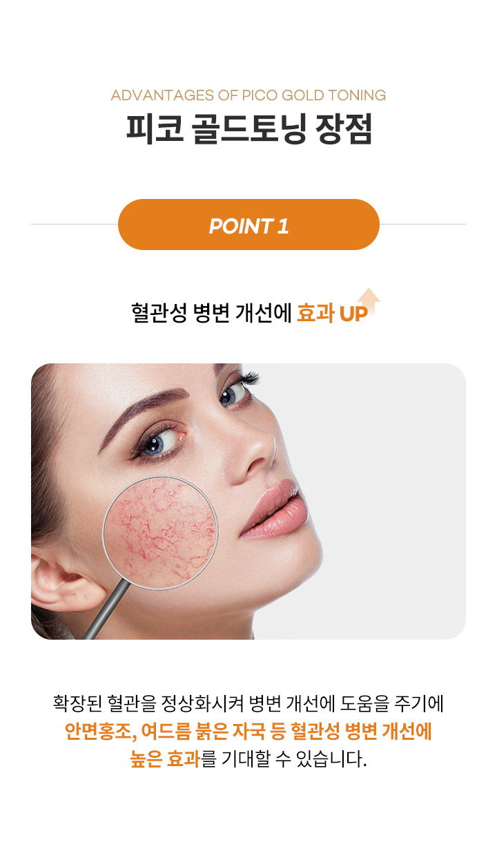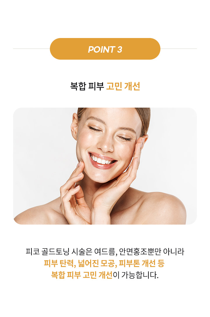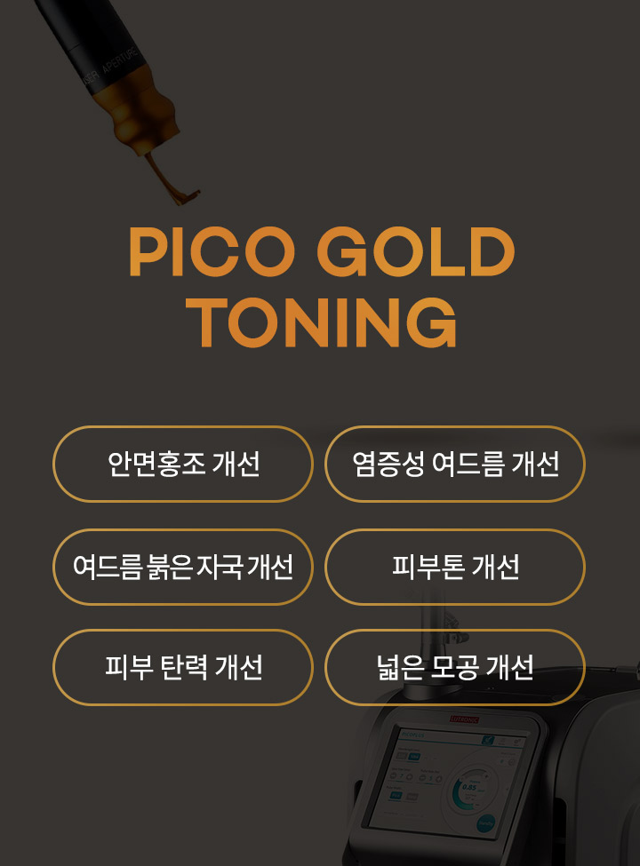 피코 골드토닝은 멜라닌과 헤모글로빈 흡수도가 높은 595nm 파장의 레이저 빛을 이용하여 여드름 치료 후 붉은 자국, 염증성 여드름, 안면홍조를 치료하는 시술입니다.