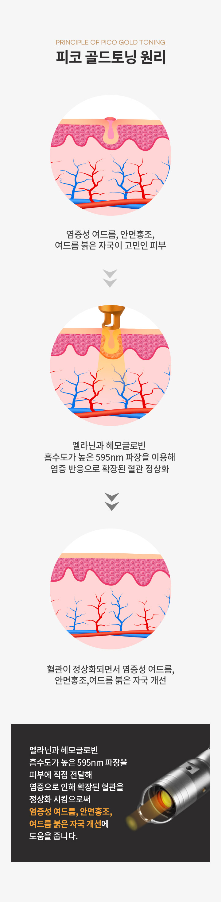 피코 골드토닝은 멜라닌과 헤모글로빈 흡수도가 높은 595nm 파장의 레이저 빛을 이용하여