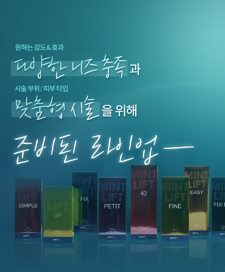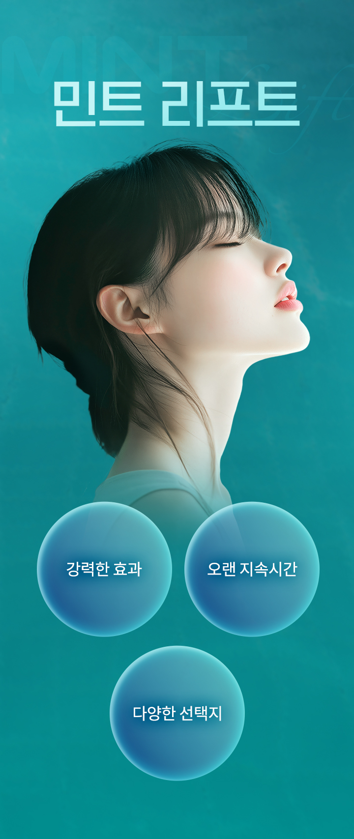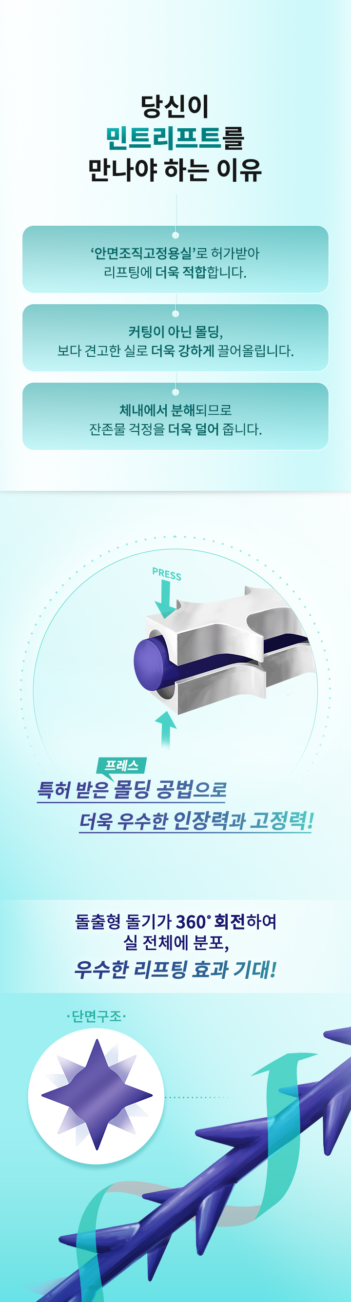 안면 조직 고정용으로 허가받은 민트 리프트는 미국 FDA 등록, 유럽 CE 인증받은 녹는 실로 우수한 고정력과 강력한 리프팅 효과가 장점입니다.