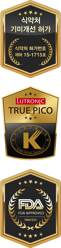피코 레이저의 빠른 속도로 피부 손상 및 시술 횟수, 통증 감소 효과 식품 의약안전처, 미국 FDA, 한국 산업 기술시험원 K 마크로 기술과 안전성을 인증받은 색소 치료 레이저입니다.