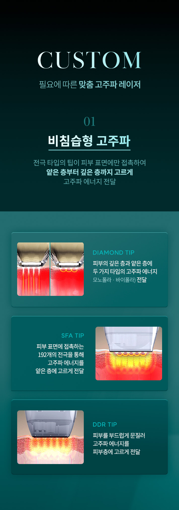 피부의 진피층에 마이크로 니들을 삽입하여 피부 표피의 손상을 완화하면서, 진피층에 순간적인 고주파를 발생시켜 피부결을 개선시키는 레이저입니다.
