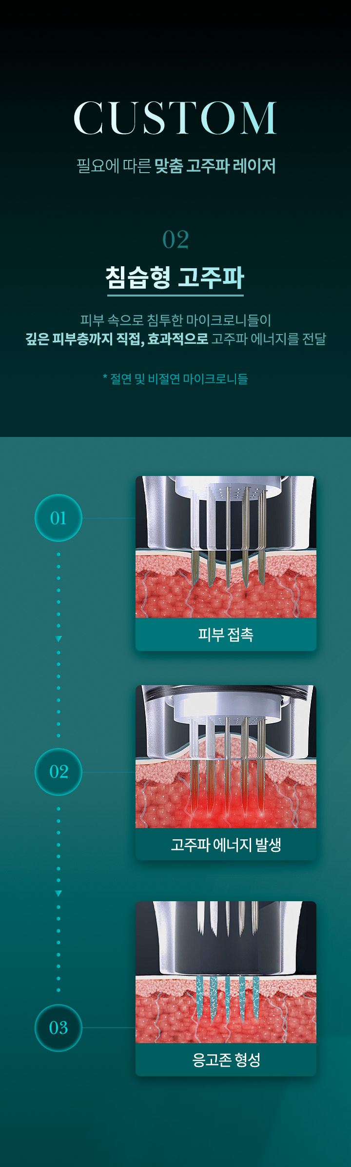 미세바늘(마이크로니들)을 통해 피부의 진피 층에 고주파(RF) 에너지를 전달하여 조직을 응고시키는 원리입니다.