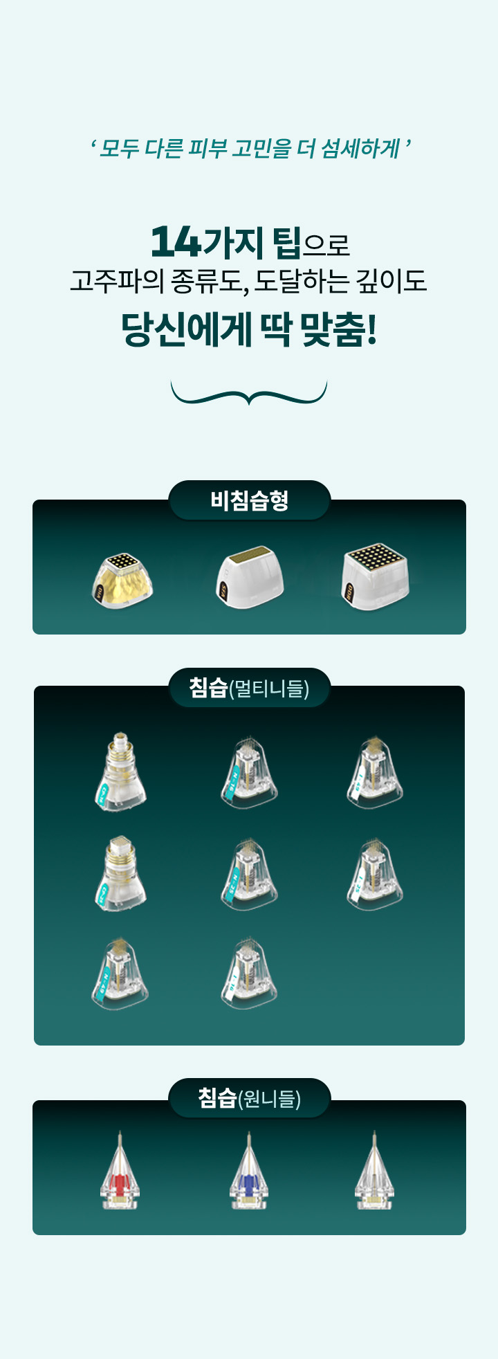 다양한 마이크로 니들 팁으로 모공, 흉터, 여드름, 홍조, 붉음증 등 피부 맞춤형 치료가 가능하며,